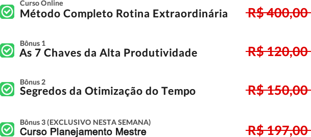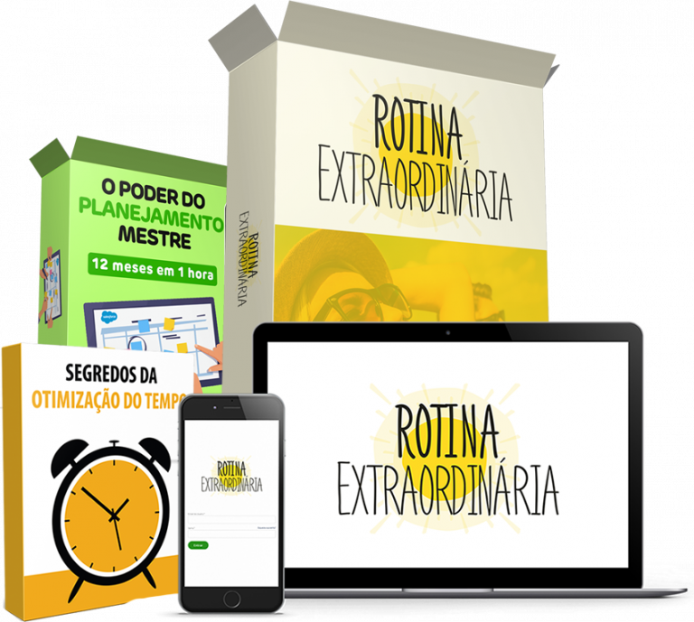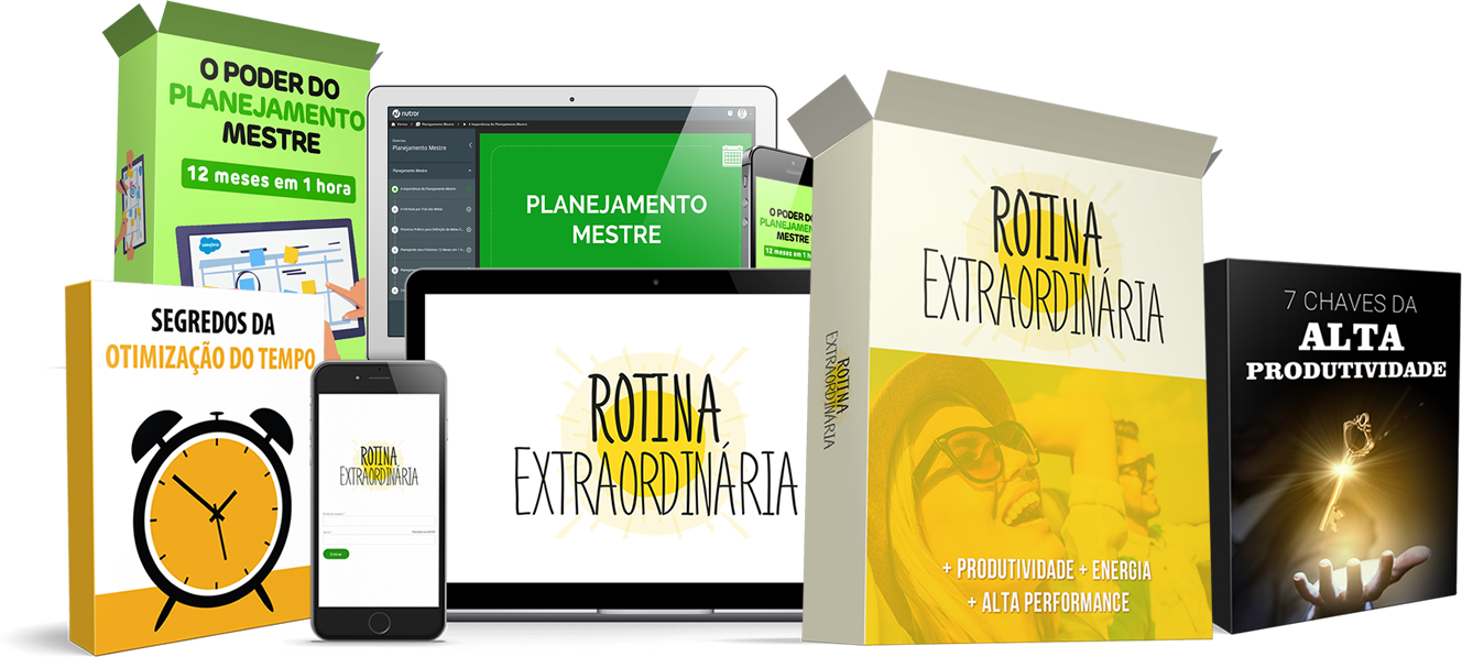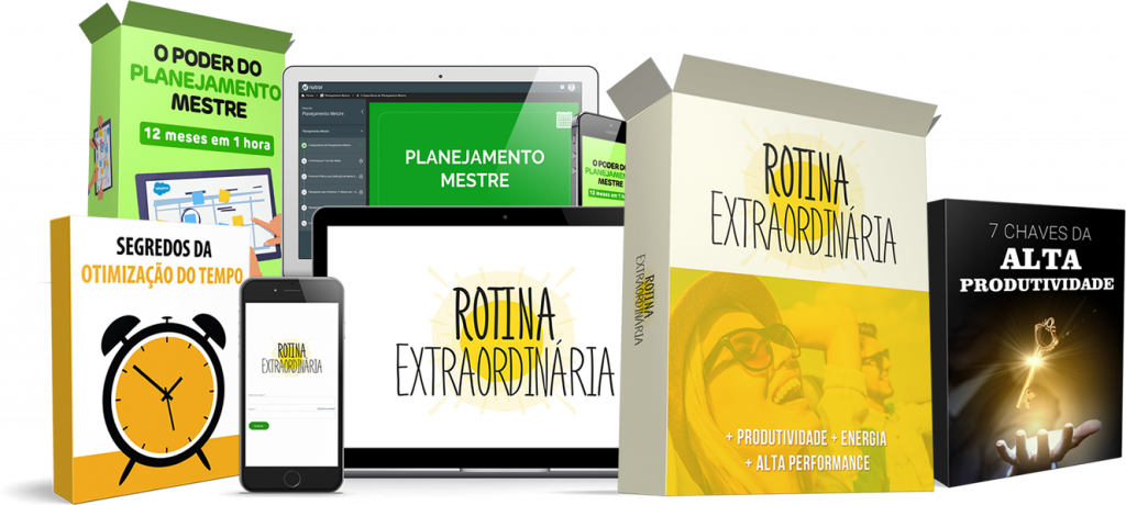 Neste Treinamento você terá acesso ao curso completo do Rotina Extraordinária e mais 3 presentes especiais, o treinamento As 7 Chaves da Alta Produtividade, Segredos da Otimização do Tempo e curso Planejamento Mestre.